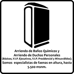 Arriendo de baños químicos para sus necesidades (Básicos, V.I.P. Ejecutivos, V.I.P. Presidencial y Minusválidos). Somos especialistas de faenas en altura, hasta 5.500 msnm.